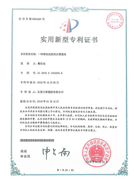 立新塑膠-注塑模具實用新型專利證書