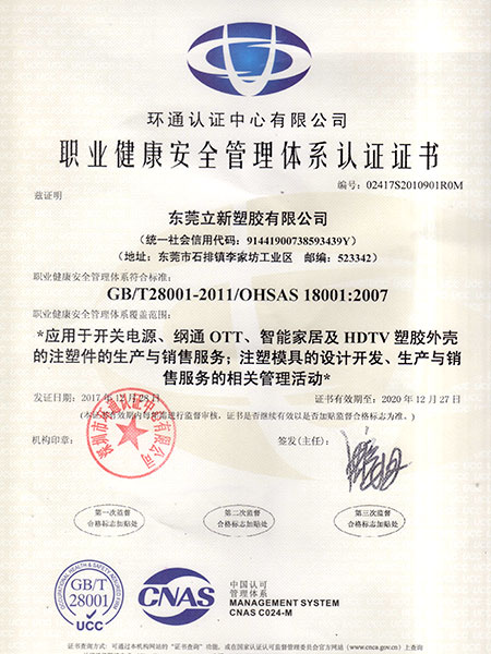 立新塑膠-職業(yè)健康安全管理體系認證證書